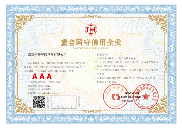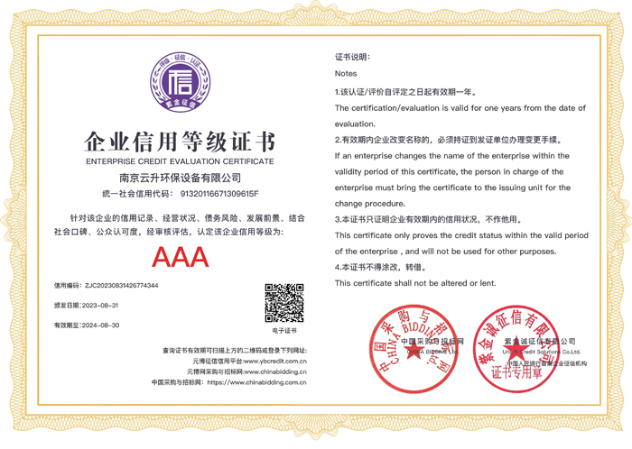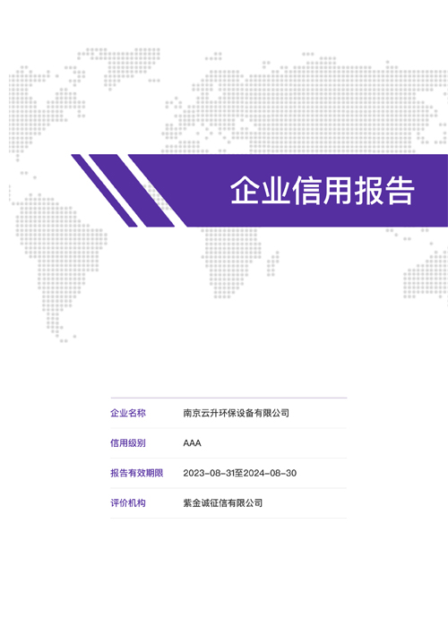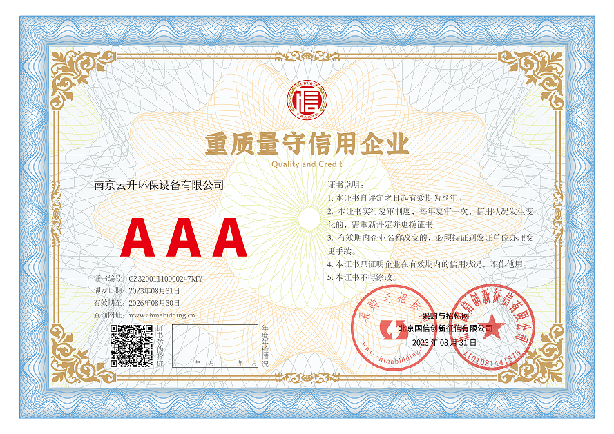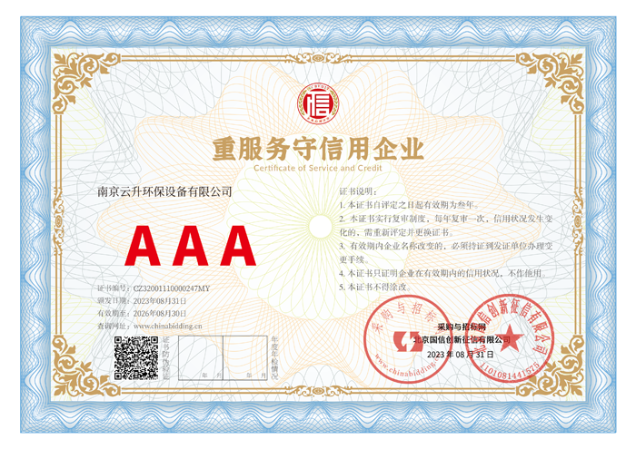 南京云升環(huán)保設備有限公司全體員工愿以環(huán)境保護為己任,以市場為導向,以優(yōu)質服務為原則,嚴格的管理、先進的生產工藝、至上的品質、完善的售前售后服務,與廣大新老用戶攜手并進,共鑄輝煌。公司已通過ISO9001:2000質量管理體系標準認證,成為江蘇省高新企業,并進行不斷的技術改進和創新,為客戶和合作伙伴提供滿意的產品。